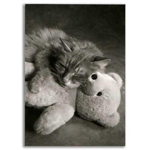 テディベアを抱きかかえるように眠っている子猫がとても可愛い一枚。